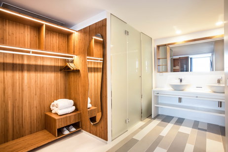 Equipamiento: King bed (180x200 cm), Vistas parciales al mar, Cama supletoria (bajo petición), Salón separado, Balcón, Servicio de habitaciones 24h (cargo), Wifi gratuito, Caja fuerte, Smart TV con canales multilingües, Altavoces Bowers & Wilkins, Secador de pelo, Ducha, Zapatillas y albornoz, Espejo de aumento en el baño, Amenities, Servicio de descubierta, Agua (diario), Minibar (cargo), Cafetera Nespresso, Libros Taschen.